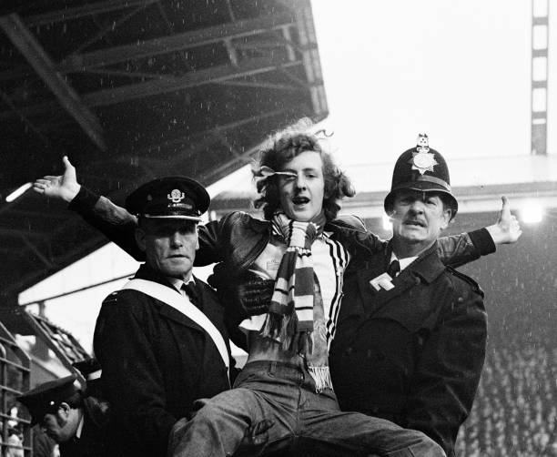 Un supporter de MU avec une fléchette dans le nez, Manchester United – Liverpool 1978. (Crédits : Harry Ormesher/Popperfoto via Getty Images)