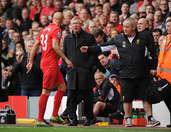 Jonjo Shelvey en confrontation avec Alex Ferguson. (Crédits : AMA/Corbis via Getty Images)