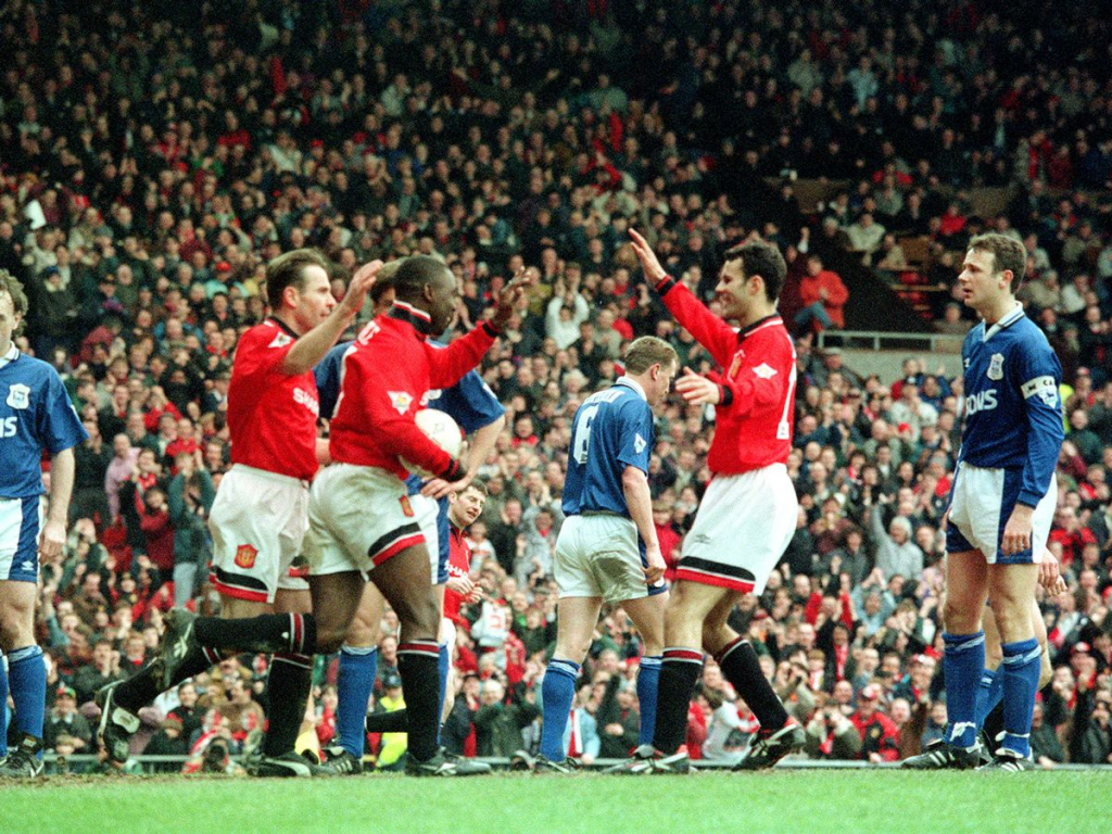 Ipswich, accolé à la dernière place pour cette 32e journée, fut paniqué dès les premières minutes de la rencontre, alors que Man Utd attaquait du côté de Stretford End. Et après un premier quart d’heure étouffant pour les visiteurs, ils craquèrent : Mark Hughes, à gauche de la surface, retrouvait de l’autre côté Roy Keane, positionné à droite et en dehors, pour une frappe après un rebond qui faisait mouche à l’aide du poteau gauche. Quatre minutes plus tard, l’arrière droit canadien d’Ipswich voit sa passe être interceptée par Ryan Giggs. Le ballon roule long de la ligne de touche, le gallois repique et sert d’Andy Cole qui se jette pour mettre son plat du pied. Deux zéro, puis trois, huit minutes avant le gong de la mi-temps, quand le jeune avant-centre de MU reprend seul face au but un magnifique retournée de Hughes qui s’est écrasé sur la barre suite à un centre de Kanchelskis.